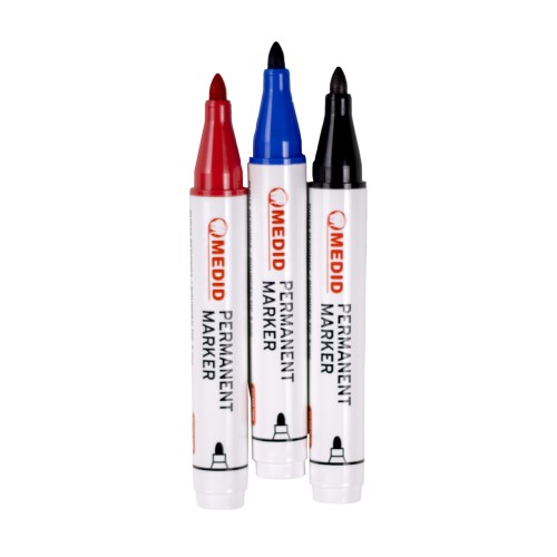 Rotulador permanente MEDID con tinta base alcohol de secado rápido y alta resistencia al agua y la luz. Diseñado para marcar sobre múltiples superficies como metal, plástico, vidrio, cartón o madera. Punta redonda de 1 a 3 mm que ofrece un trazo uniforme y preciso. Cuerpo de plástico resistente con tapón hermético y clip de sujeción. Libre de xileno. Disponible en varios colores.